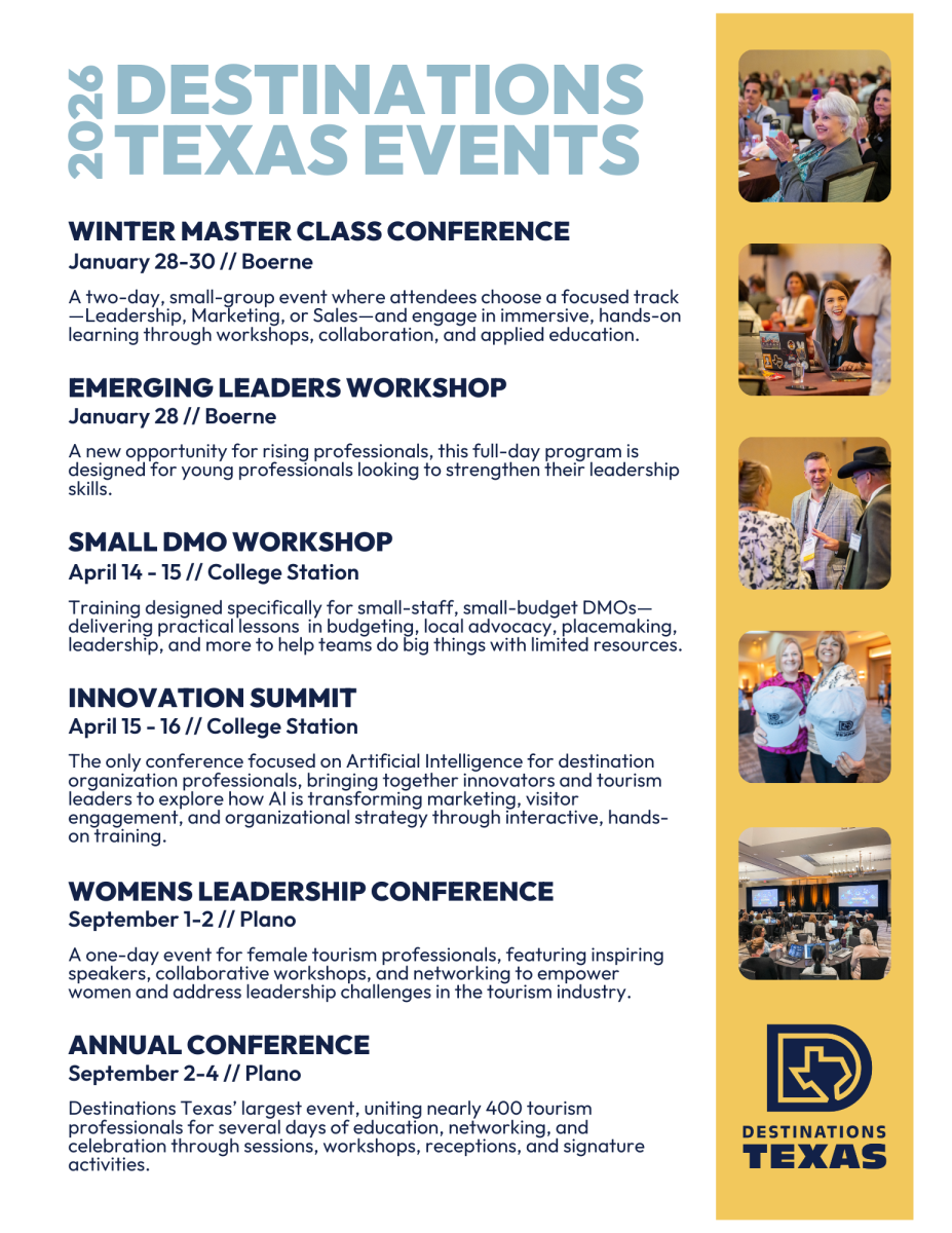 Destinations Texas prides itself on being the leader in tourism education in Texas, thanks to the support and participation of the finest thought leaders in the industry. See below for information on upcoming industry-specific events!