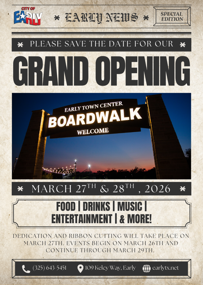Join us for a memorable day filled with excitement, including live music on the boardwalk, food trucks, and a glow run! A special ceremony at 3 PM will mark this significant occasion for the City of Early.